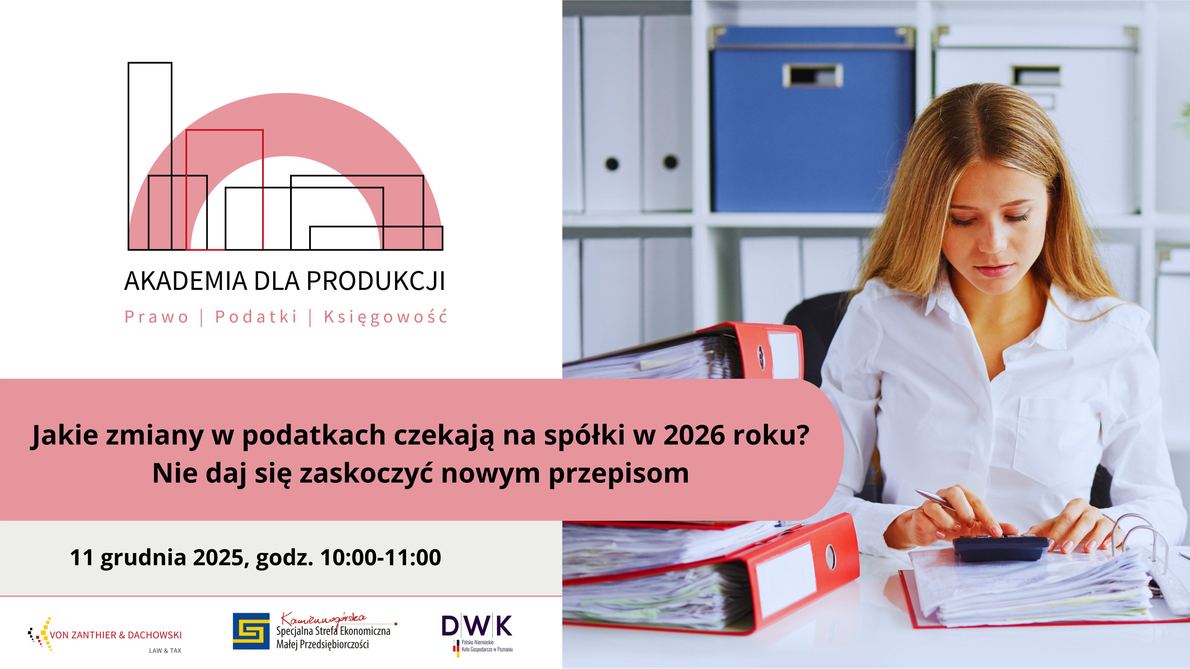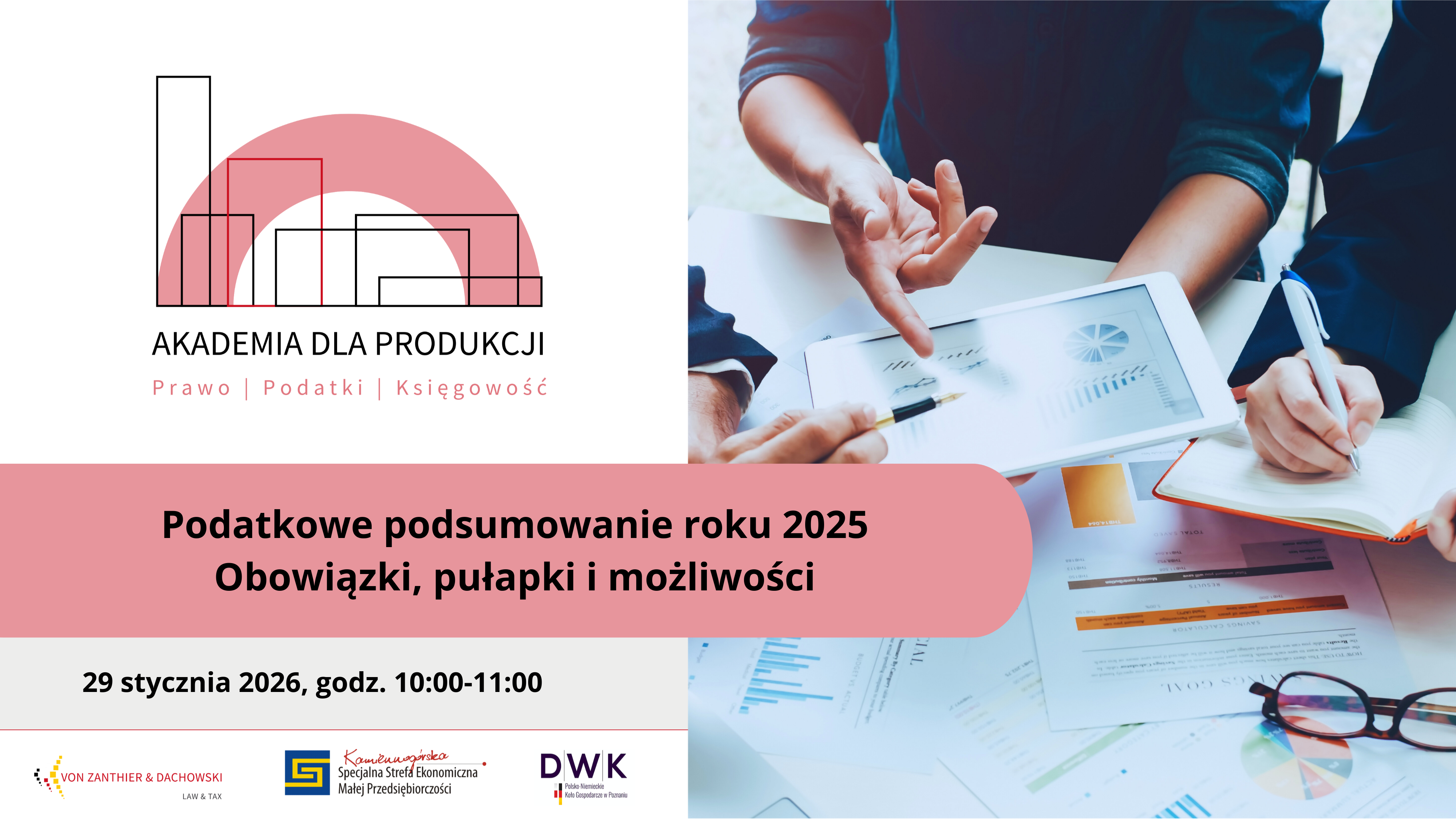 Akademia dla Produkcji. Prawo | Podatki | Księgowość to autorski cykl webinarów szkoleniowych, które poświęcone są wyzwaniom prawnym, podatkowym i księgowym, z jakimi mierzą się w szczególności firmy produkcyjne powiązane kapitałowo z regionem DACH (Niemcy, Austria, Szwajcaria). Akademia dla Produkcji. Prawo | Podatki | Księgowość to unikalna okazja, aby regularnie poszerzać swoją wiedzę i poznać najnowsze zmiany w przepisach, które mają bezpośredni wpływ na Państwa działalność. Więcej o cyklu jak również o poszczególnych webinarach można dowiedzieć się na STRONIE INTERNETOWEJ CYKLU.