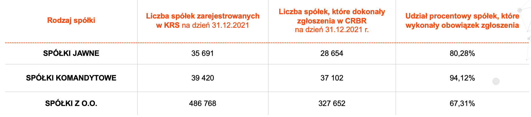 Jak wynika z raportu CRDIO Legal na podstawie danych uzyskanych od Ministerstwa Sprawiedliwości i Krajowej Izby Skarbowej w Bydgoszczy, wśród analizowanych 3 form prawnych prowadzenia biznesu, najlepiej z obowiązku zgłoszenia wywiązywały się spółki jawne (80% go wykonało), a w najmniejszym stopniu spółki z ograniczoną odpowiedzialnością (67%). Może to być podyktowane bardziej skomplikowaną strukturą własnościową utrudniającą dokonanie analizy w zakresie beneficjenta rzeczywistego, jak i dokonanie zgłoszenia w terminie – komentuje Mateusz Baran, partner w CRIDO Legal.