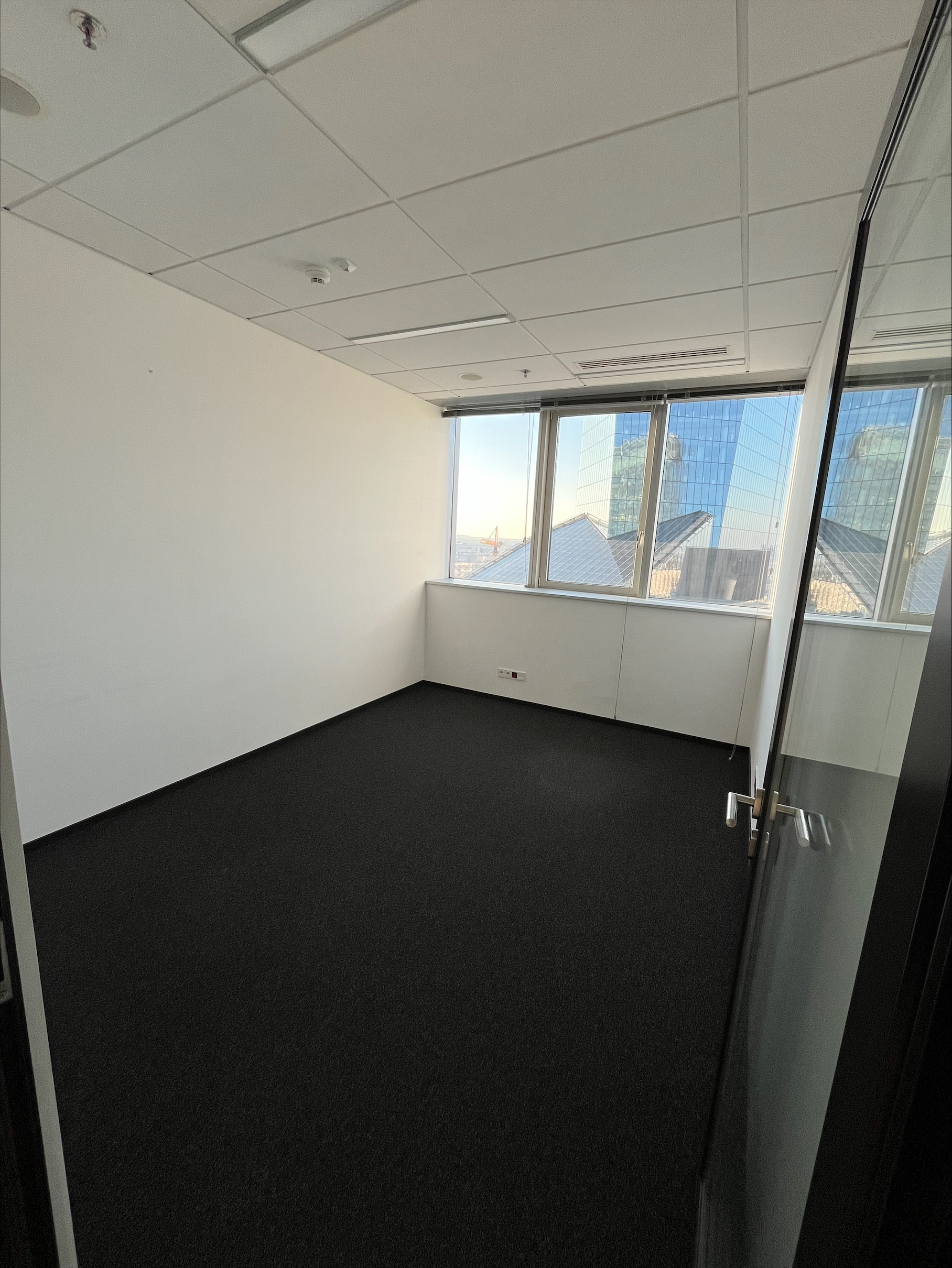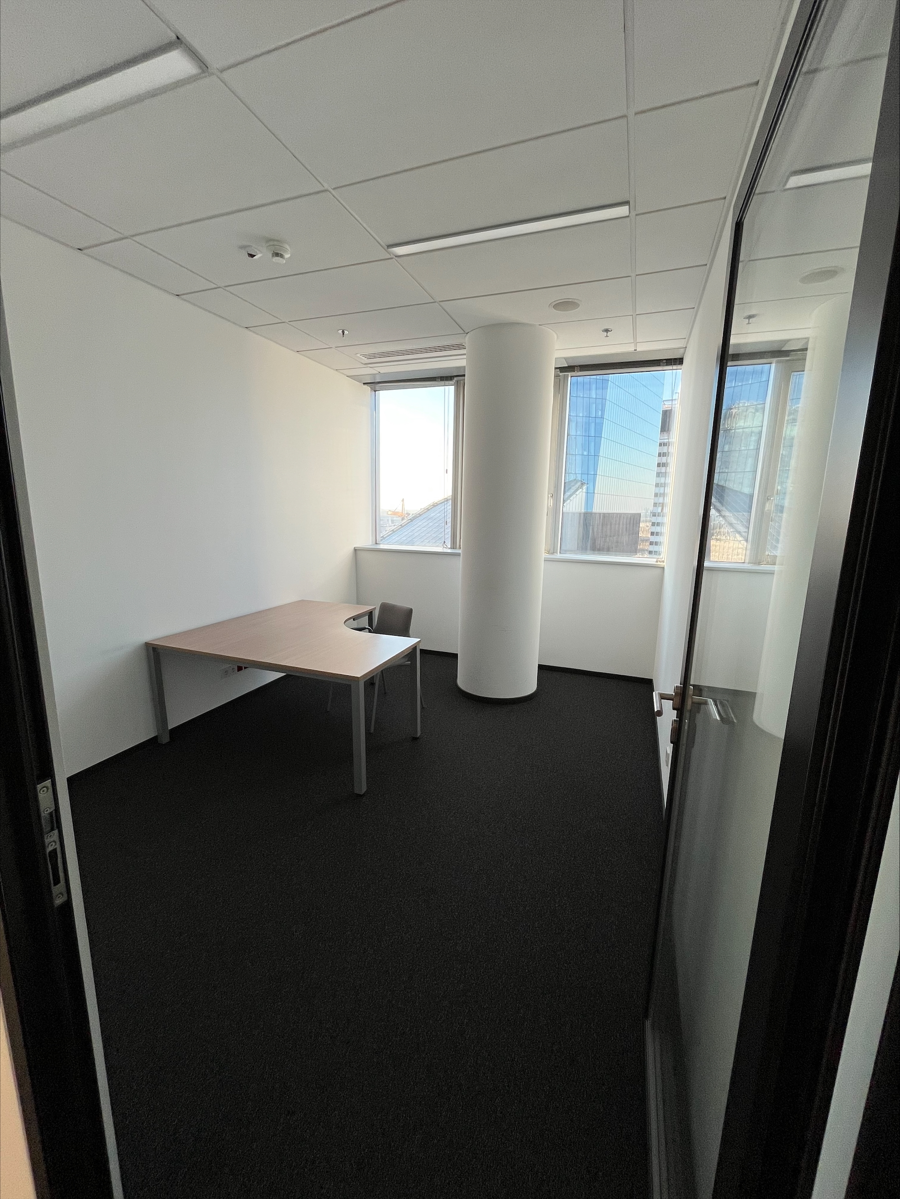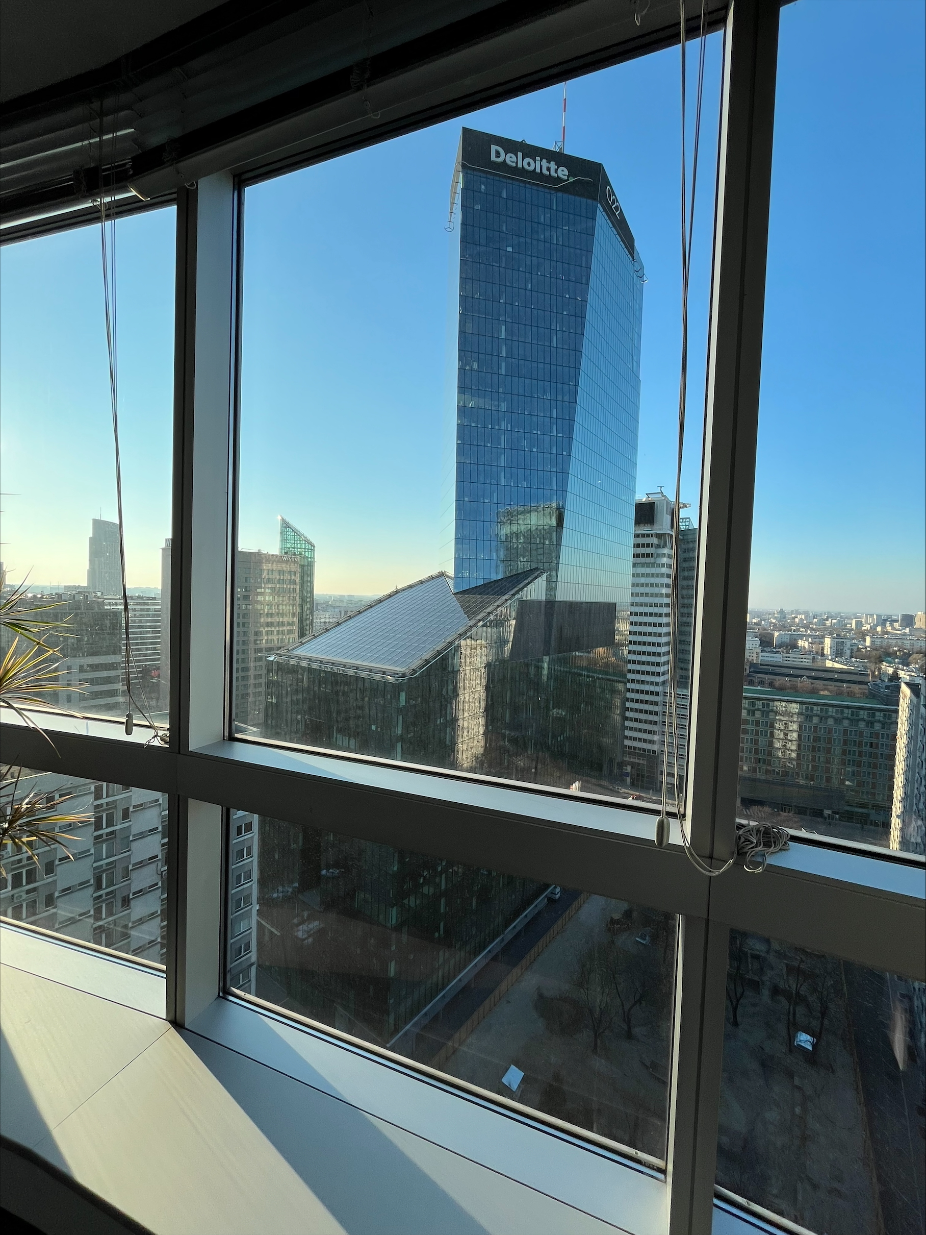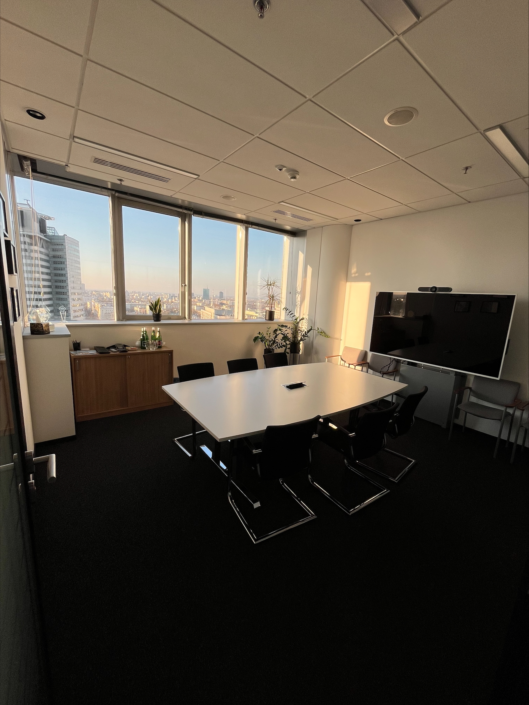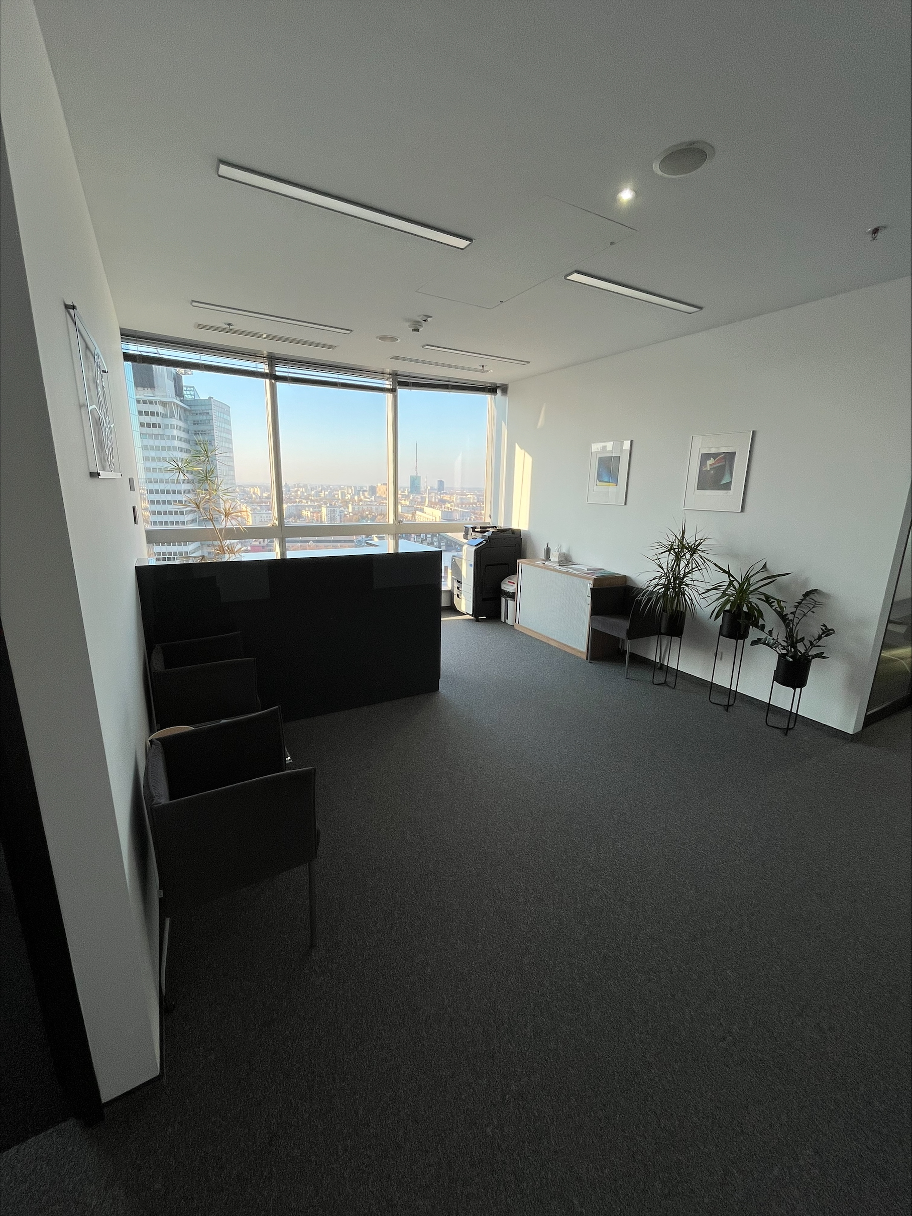 Biuro wyróżnia się wysokim standardem wykończenia, dużym dostępem światła dziennego oraz imponującym widokiem na panoramę miasta, co zapewnia komfortowe warunki pracy.