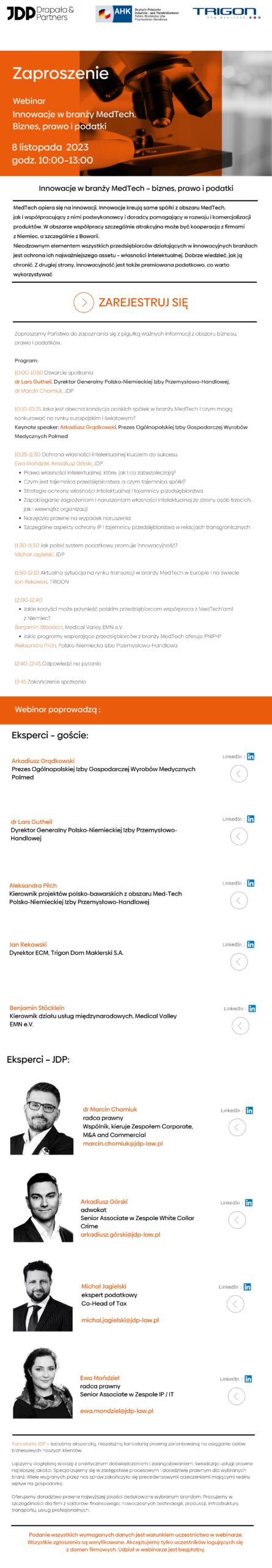 Webinar JDP, AHK i Trigon: Innowacje w branży MedTech – biznes, prawo i podatki | 8 listopada godz. 10:00