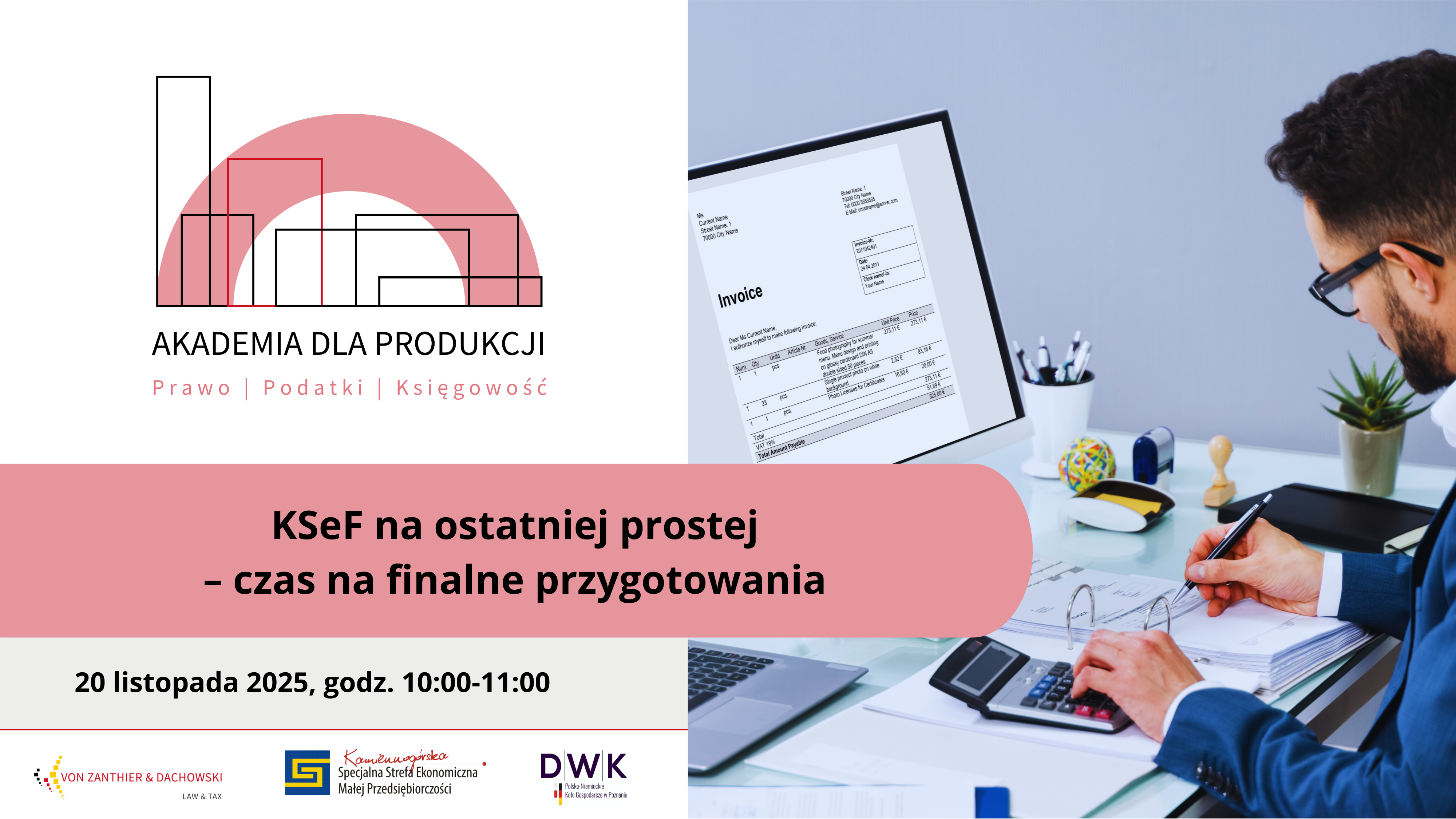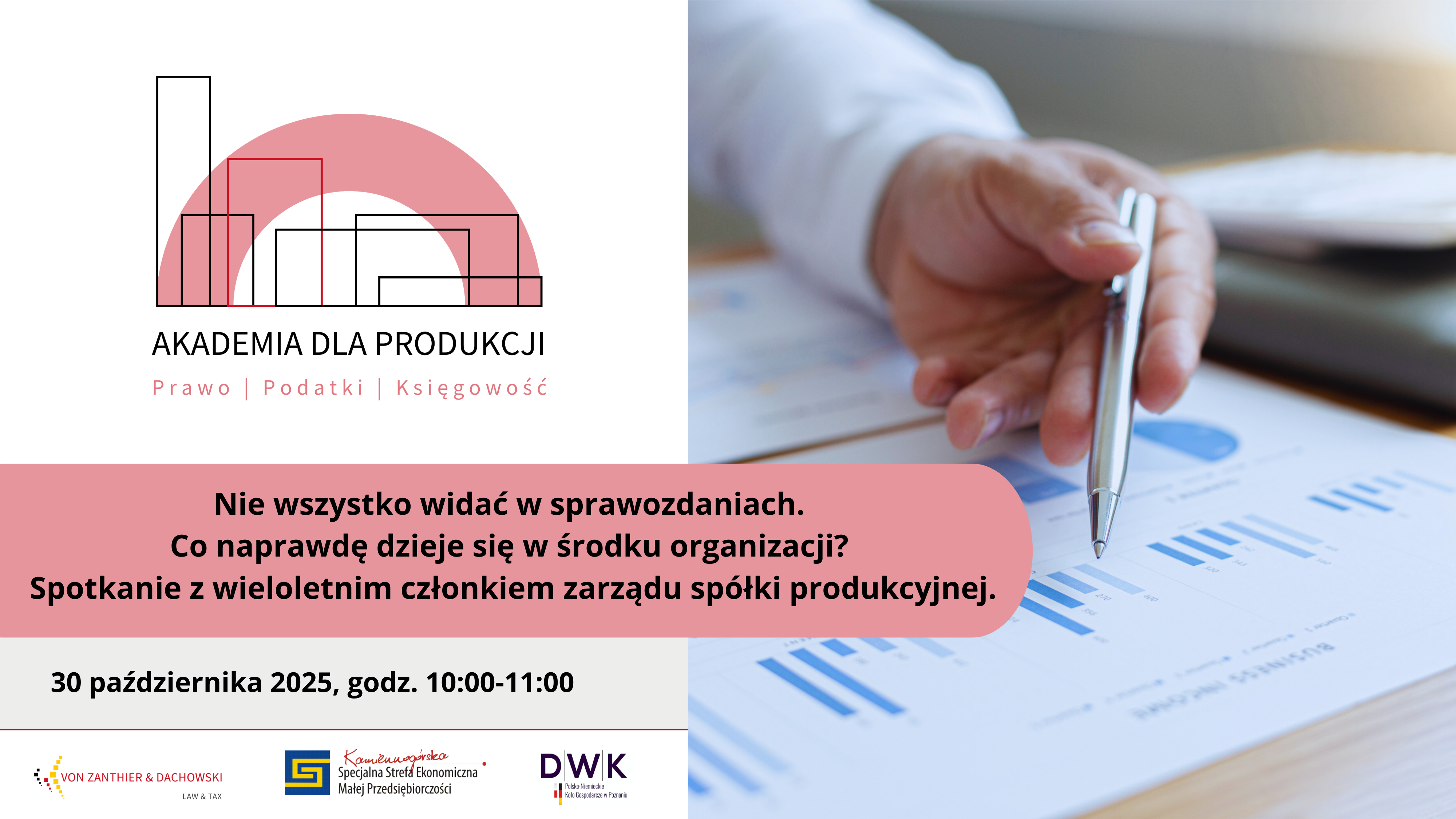 Akademia dla Produkcji. Prawo | Podatki | Księgowość to autorski cykl webinarów szkoleniowych, które poświęcone są wyzwaniom prawnym, podatkowym i księgowym, z jakimi mierzą się w szczególności firmy produkcyjne powiązane kapitałowo z regionem DACH (Niemcy, Austria, Szwajcaria). Akademia dla Produkcji. Prawo | Podatki | Księgowość to unikalna okazja, aby regularnie poszerzać swoją wiedzę i poznać najnowsze zmiany w przepisach, które mają bezpośredni wpływ na Państwa działalność. Więcej o cyklu jak również o poszczególnych webinarach można dowiedzieć się na STRONIE INTERNETOWEJ CYKLU.
