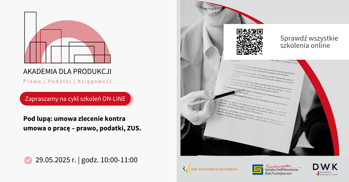 Webinar “Pod lupą: umowa zlecenie kontra umowa o pracę- PRAWO, PODATKI, ZUS” odbędzie się w czwartek, 29 maja 2025 r., godz. 10:00-11:00.  Rejestracja na webinar jest możliwa TUTAJ.