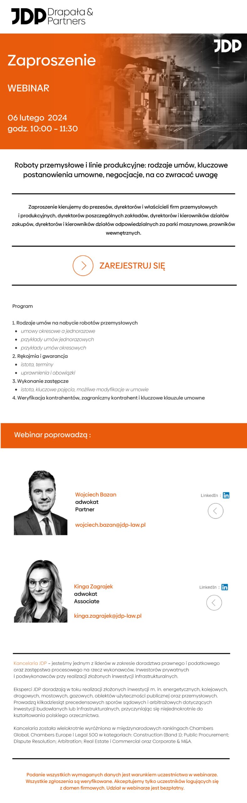 Roboty przemysłowe i linie produkcyjne: rodzaje umów, kluczowe postanowienia umowne, negocjacje | Webinar JDP | 06.02.24 REJESTRACJA
