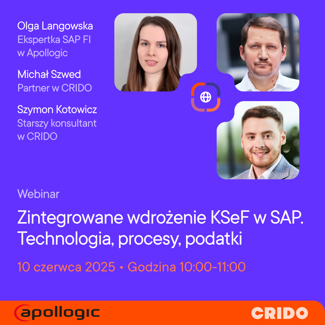 Zapraszamy na bezpłatny webinar, w czasie którego eksperci CRIDO i Apollogic omówią proces wdrażania Krajowego Systemu e-Faktur (KSeF) środowisku SAP.