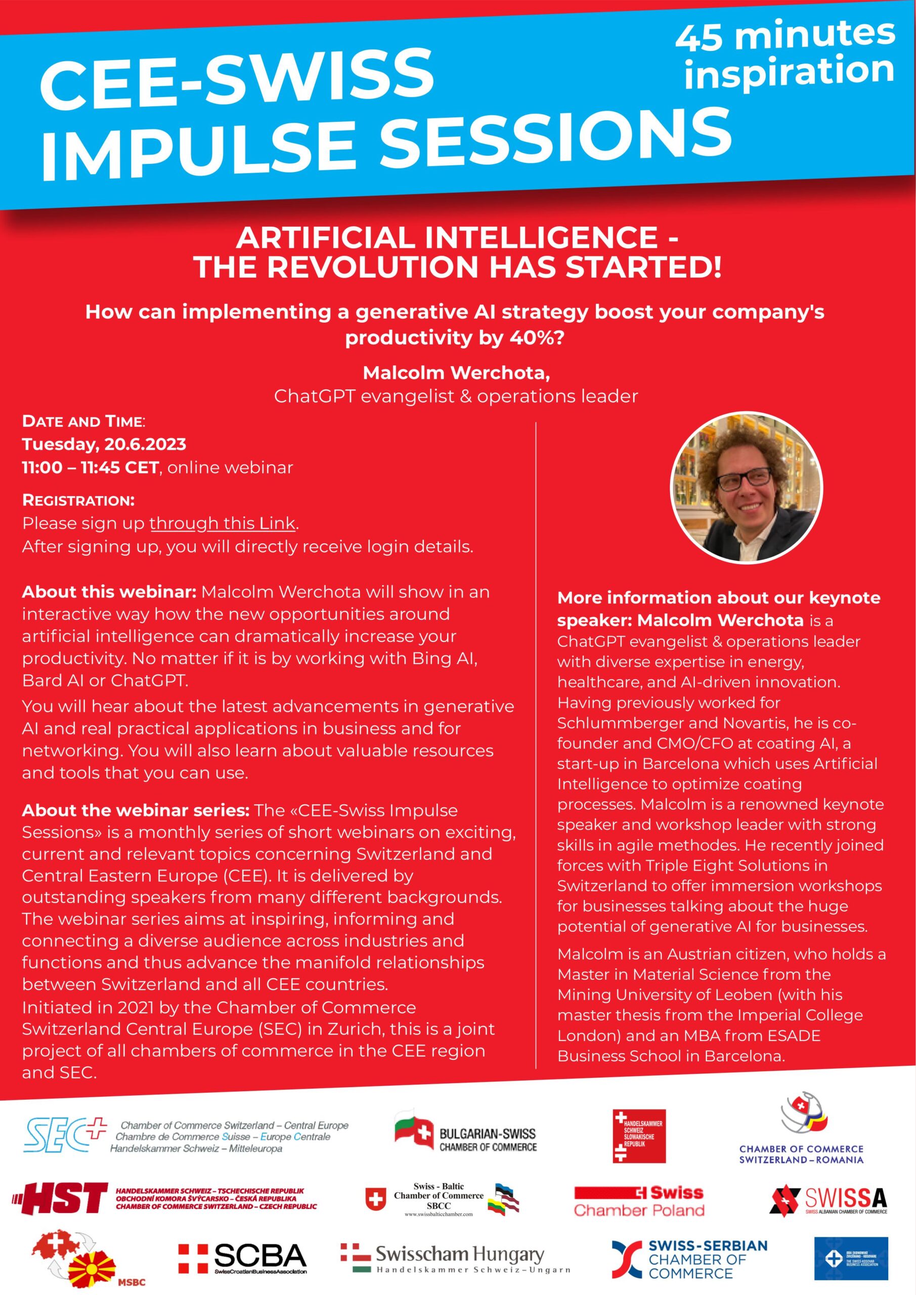 CEE-Swiss Impulse Sessions: Artificial Intelligence – the Revolution has Started! Date: 20.06.2023, 11:00 - 11:45 Location: Online