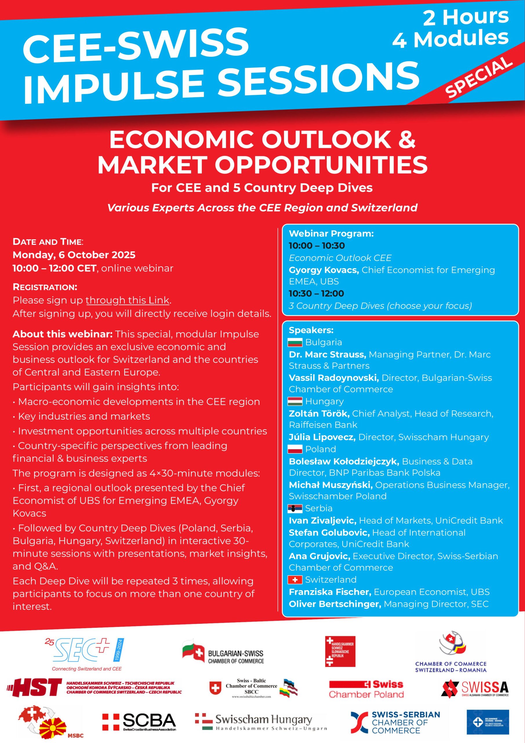 CEE-Swiss Impulse Sessions – Economic Outlook & Market Opportunities Date: 06.10.2025, 10:00 - 12:00 Location: Online REGISTRATION