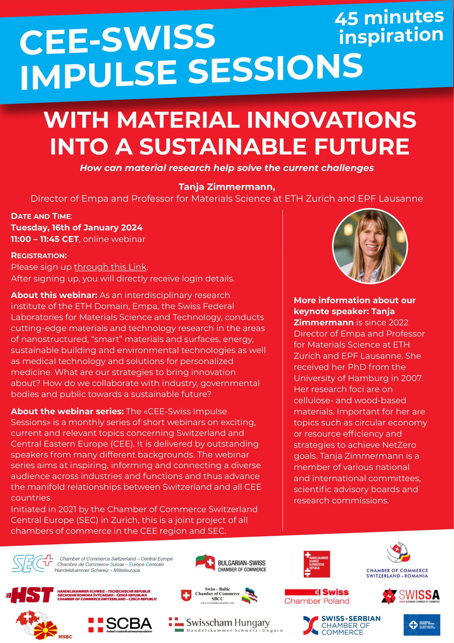 CEE-Swiss Impulse Sessions: With Material Innovations Into a Sustainable Future Date: 16.01.2024, 11:00 - 11:45 Location: Online