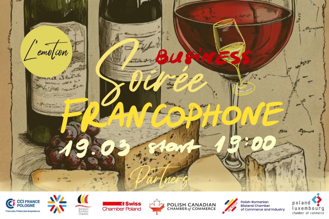 On the occasion of the International Francophonie Day, we are delighted to invite you to an exclusive professional networking evening organised in collaboration with: the Belgian Business Chamber (BBC), the French-Polish Chamber of Commerce, the Polish-Canadian Chamber of Commerce (PCCC), the Polish-Luxembourg Chamber of Commerce, the Polish-Romanian Bilateral Chamber of Commerce and Industry and Réseau Francophone de l’Entrepreneuriat en Pologne (RFE).