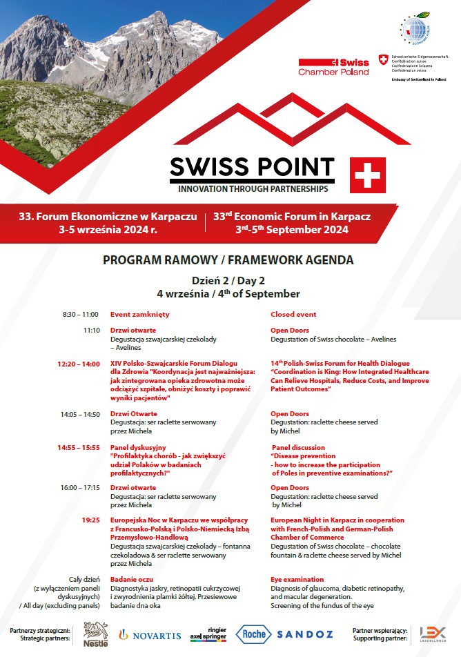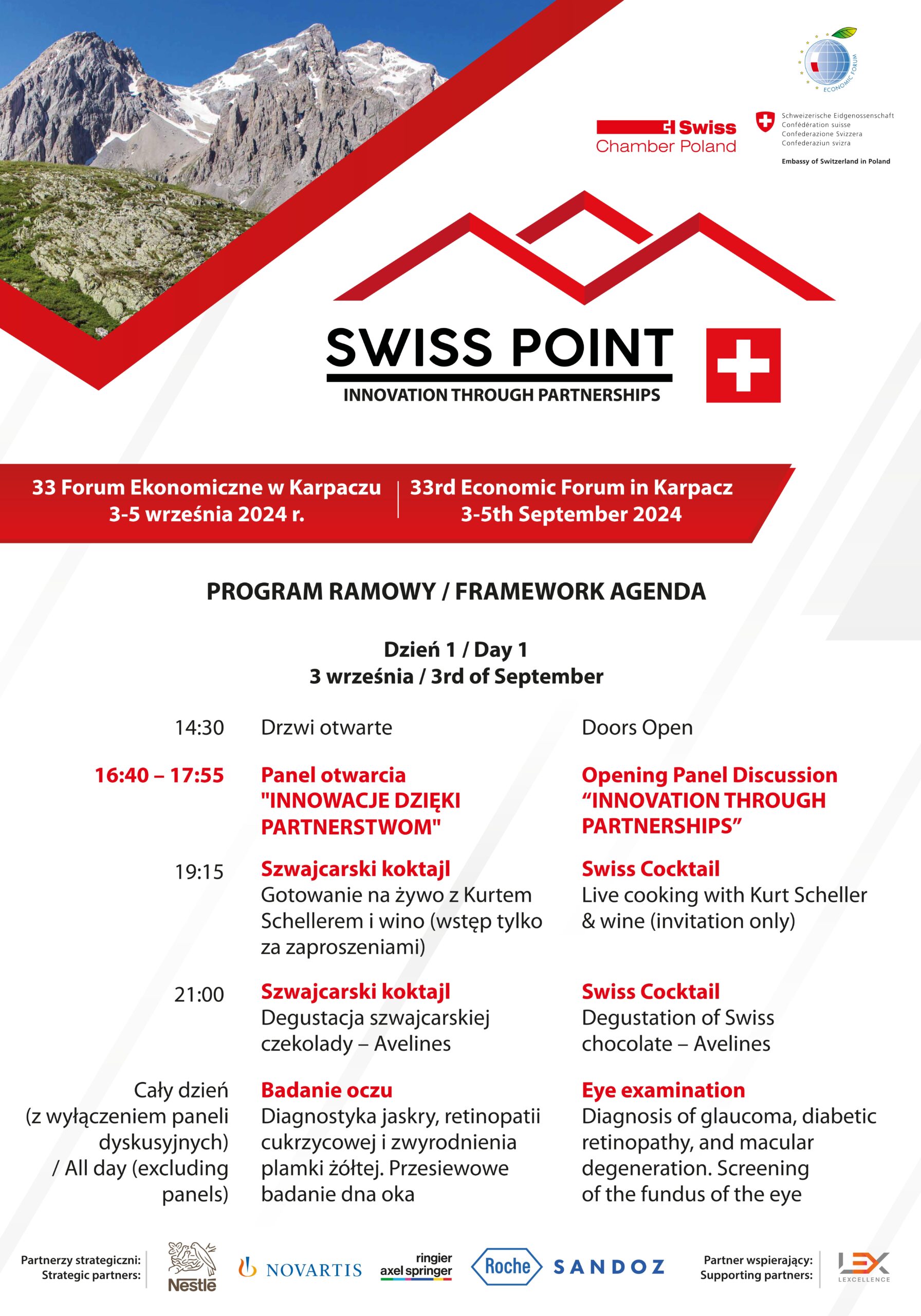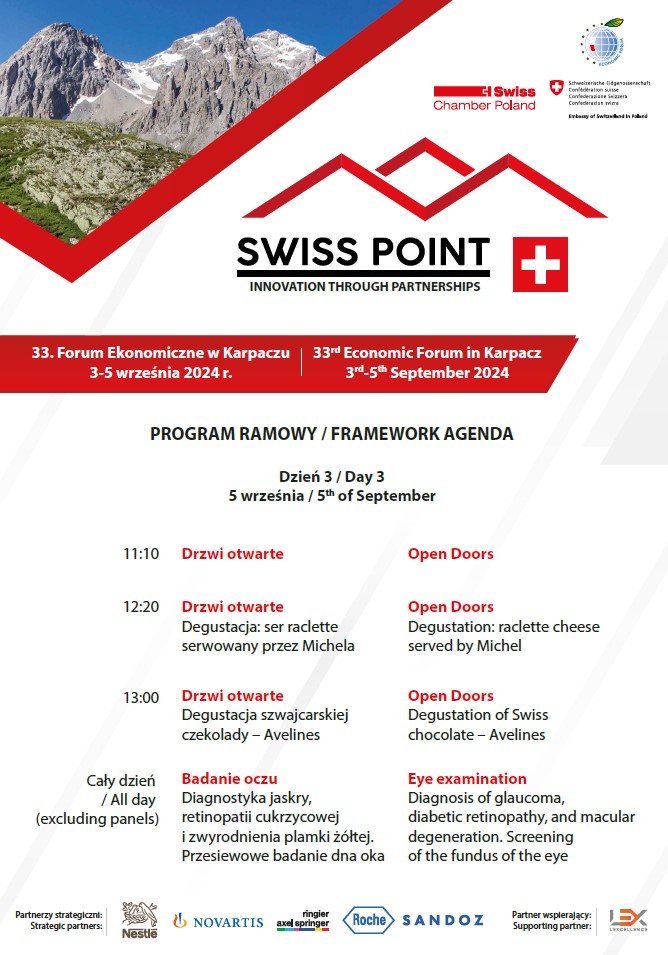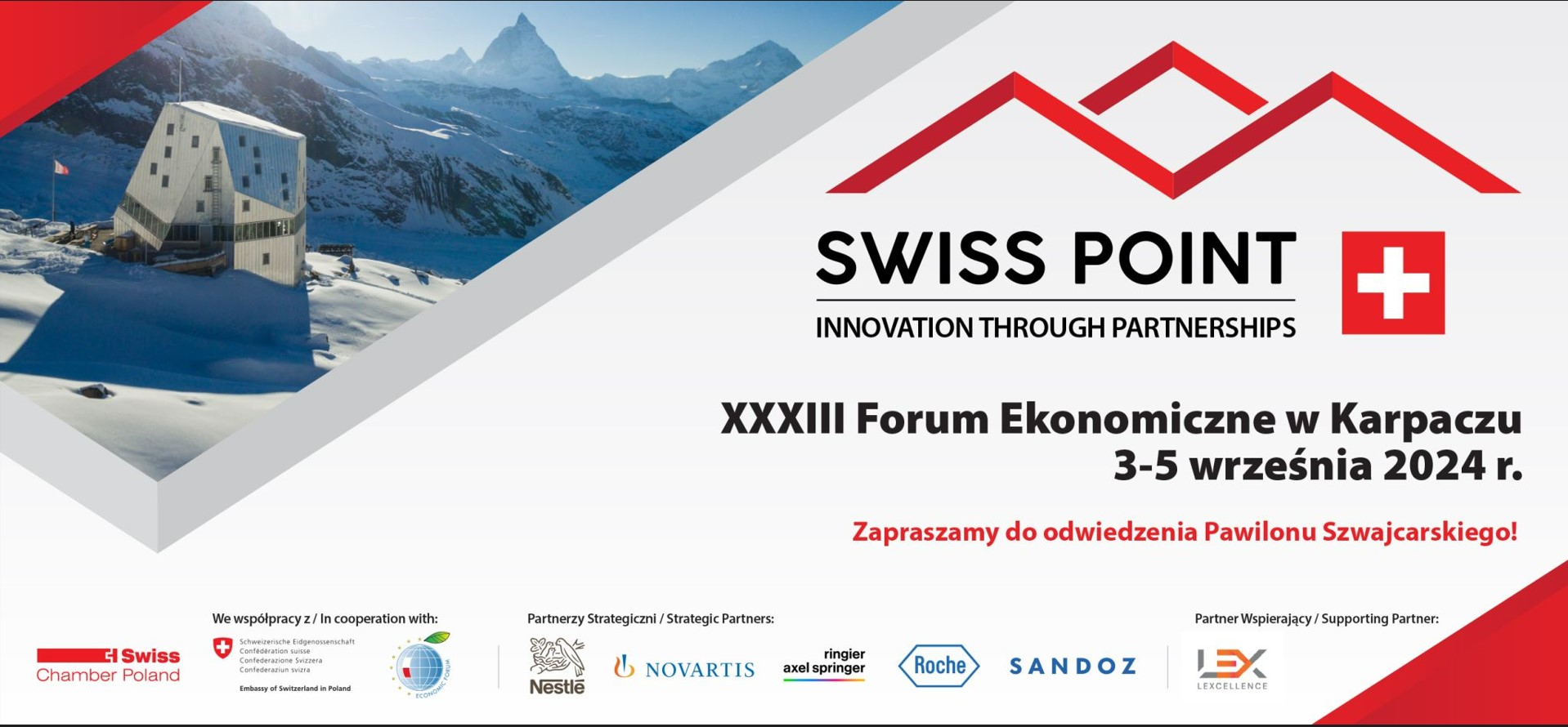 On September 3-5, 2024, the Polish-Swiss Chamber of Commerce in cooperation with the Embassy of Switzerland in Poland and Strategic Partners Nestlé, Novartis, Ringier Axel Springer, Roche and Sandoz and Supporting Partner LEXcellence and In-kind Partners Magical Raclette Show and SSC Distribution will organize the Swiss Point pavilion during the Economic Forum in Karpacz.