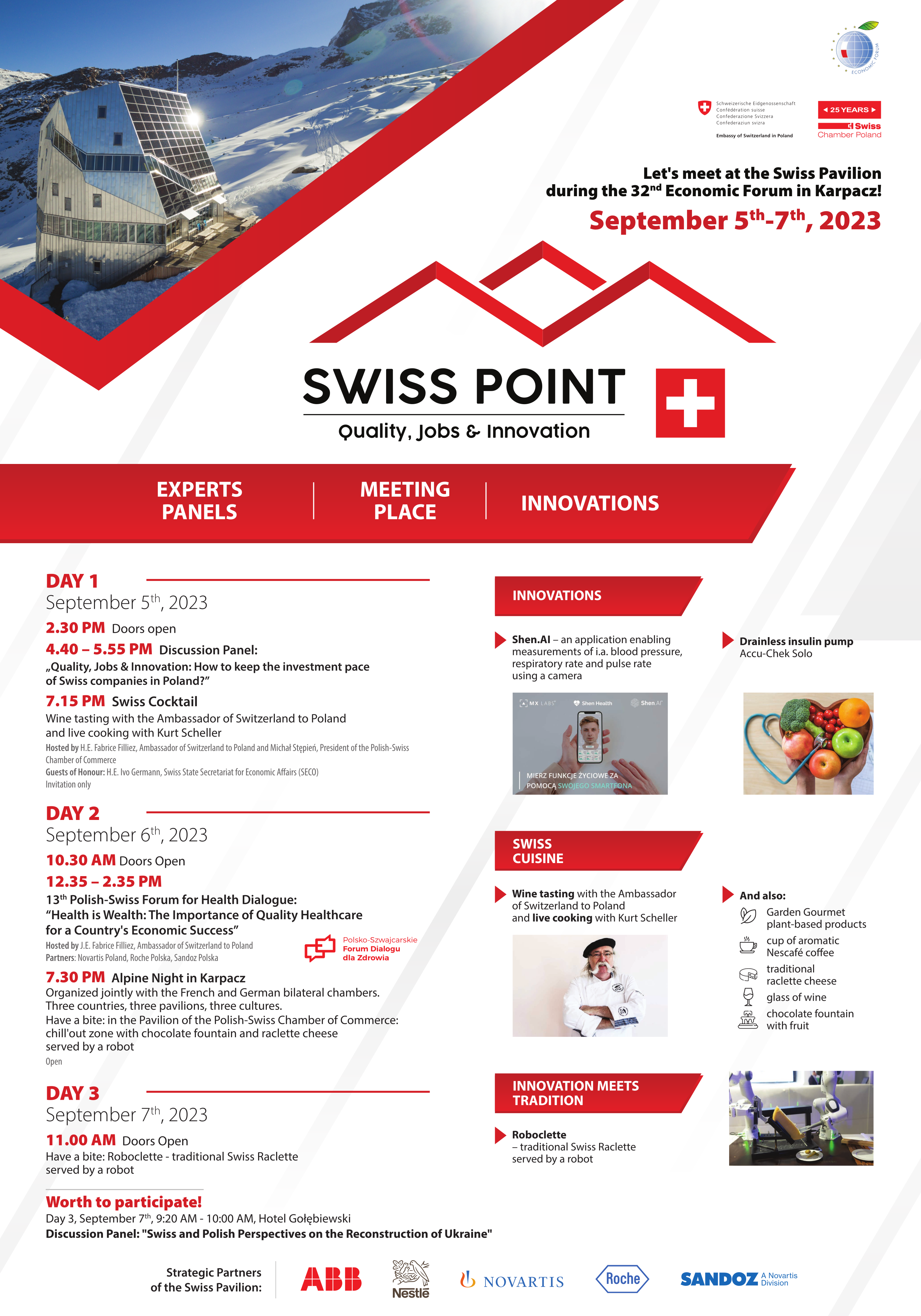 We are very pleased to inform that this year the Swiss Chamber became a partner of the XXXII Economic Forum in Karpacz, where the Swiss Pavilion will appear for the first time. The event will take place on September 5 – 7, 2023, and its motto will be “New values of the Old Continent – Europe on the verge of change”.