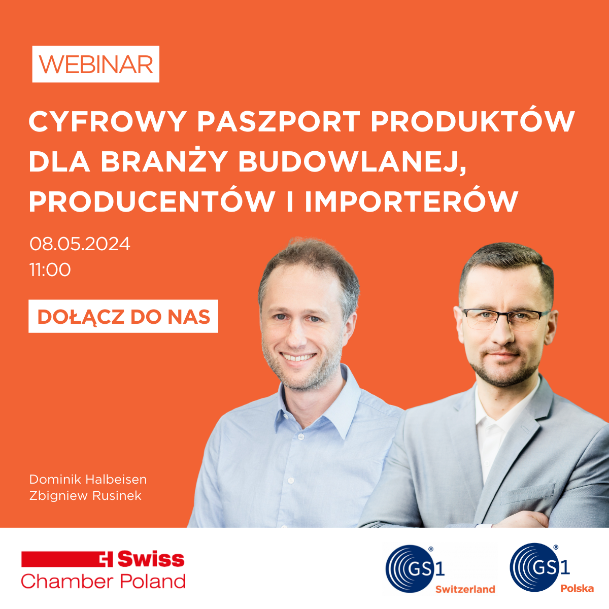 We cordially invite you to the webinar “Digital product passport for the construction industry, manufacturers and importers”. The partner will be GS1 Switzerland and the speakers will be Dominik Halbeisen and Zbigniew Rusinek.