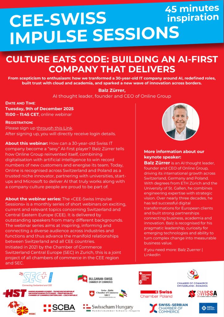 CEE-Swiss Impulse Sessions – Culture Eats Code: Building an AI-first Company That Delivers! Data: 09.12.2025, 11:00 - 11:45 Lokalizacja: Online REJESTRACJA