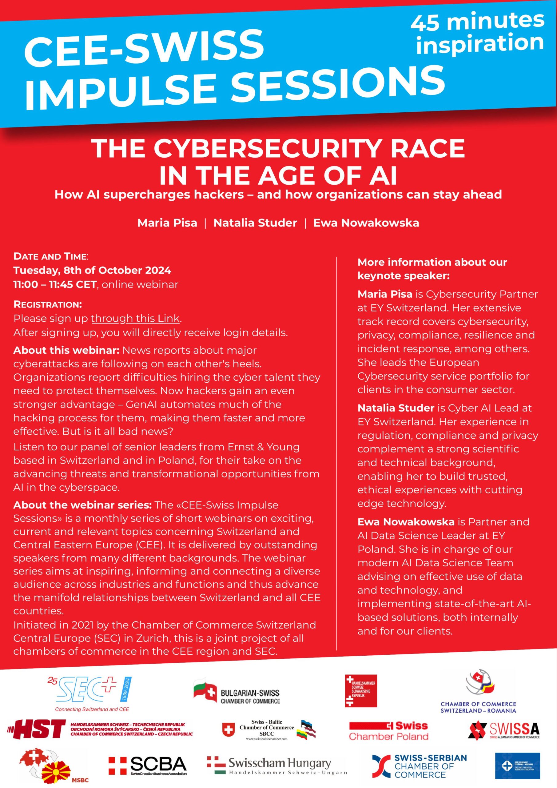 CEE-Swiss Impulse Sessions: The Cybersecurity Race in the Age of AI Data: 08.10.2024, 11:00 - 11:45 Lokalizacja: Online