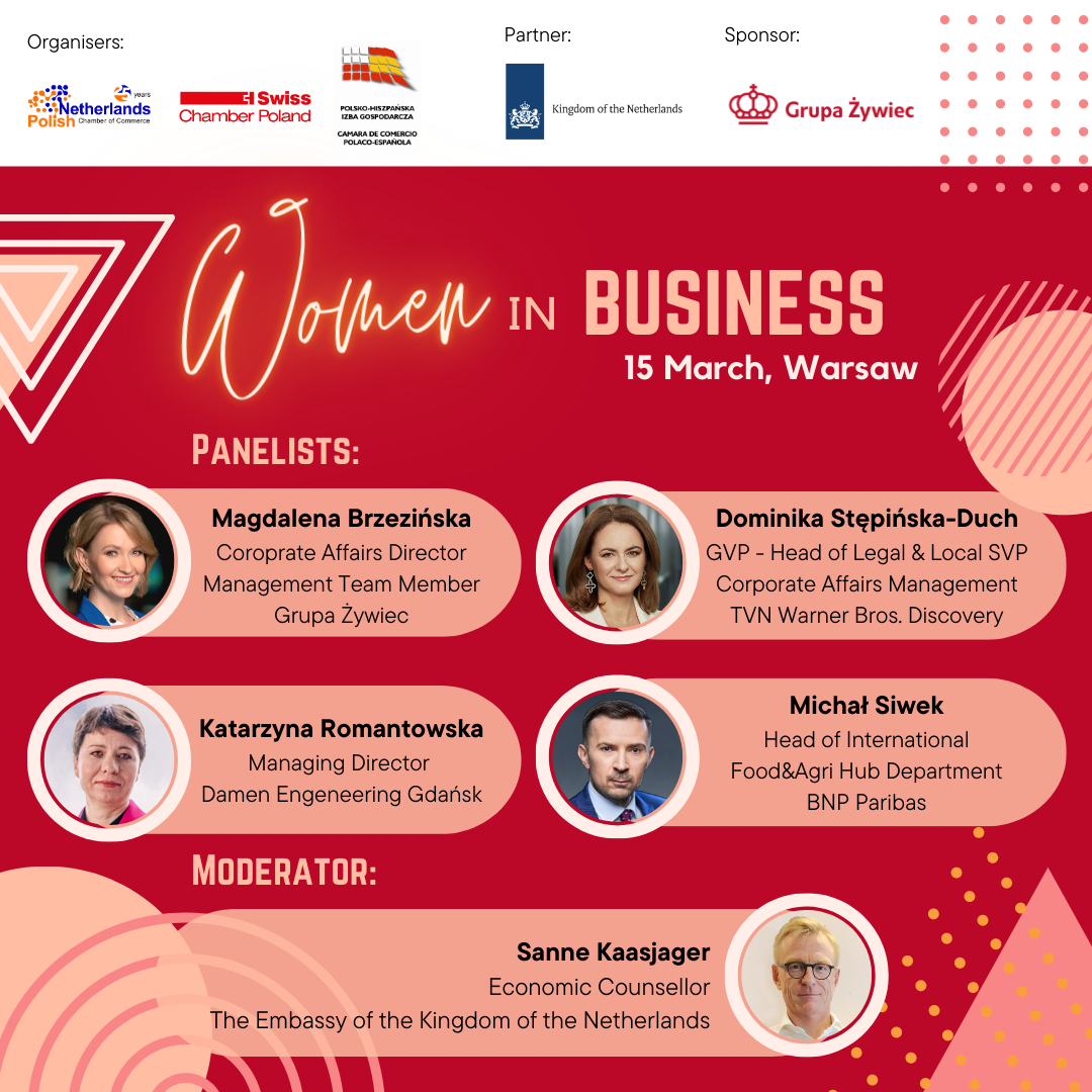 Z okazji przypadającego w marcu Międzynarodowego Dnia Kobiet mamy przyjemność zaprosić Państwa na panel dyskusyjny i networking biznesowy, organizowany przez Holendersko-Polską Izbę Gospodarczą we współpracy z Ambasadą Królestwa Niderlandów, Polsko-Szwajcarską Izba Gospodarczą i Grupą Żywiec.