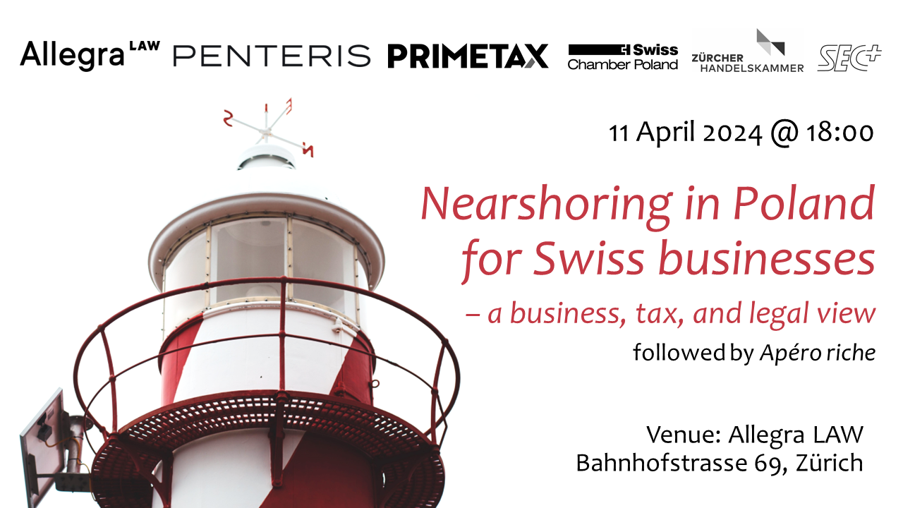 Serdecznie zapraszamy na event Nearshoring in Poland for Swiss businesses – a business, tax and legal view, który odbędzie się 11.04.2024 w Zurychu, w siedzibie firmy Allegra LAW w jęz. angielskim.