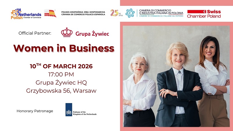Z okazji przypadającego w marcu Międzynarodowego Dnia Kobiet mamy przyjemność zaprosić Państwa na panel dyskusyjny i networking biznesowy „Women in Business”, współorganizowany przez 4 izby bilateralne: holenderską, hiszpańską, włoską i szwajcarską.